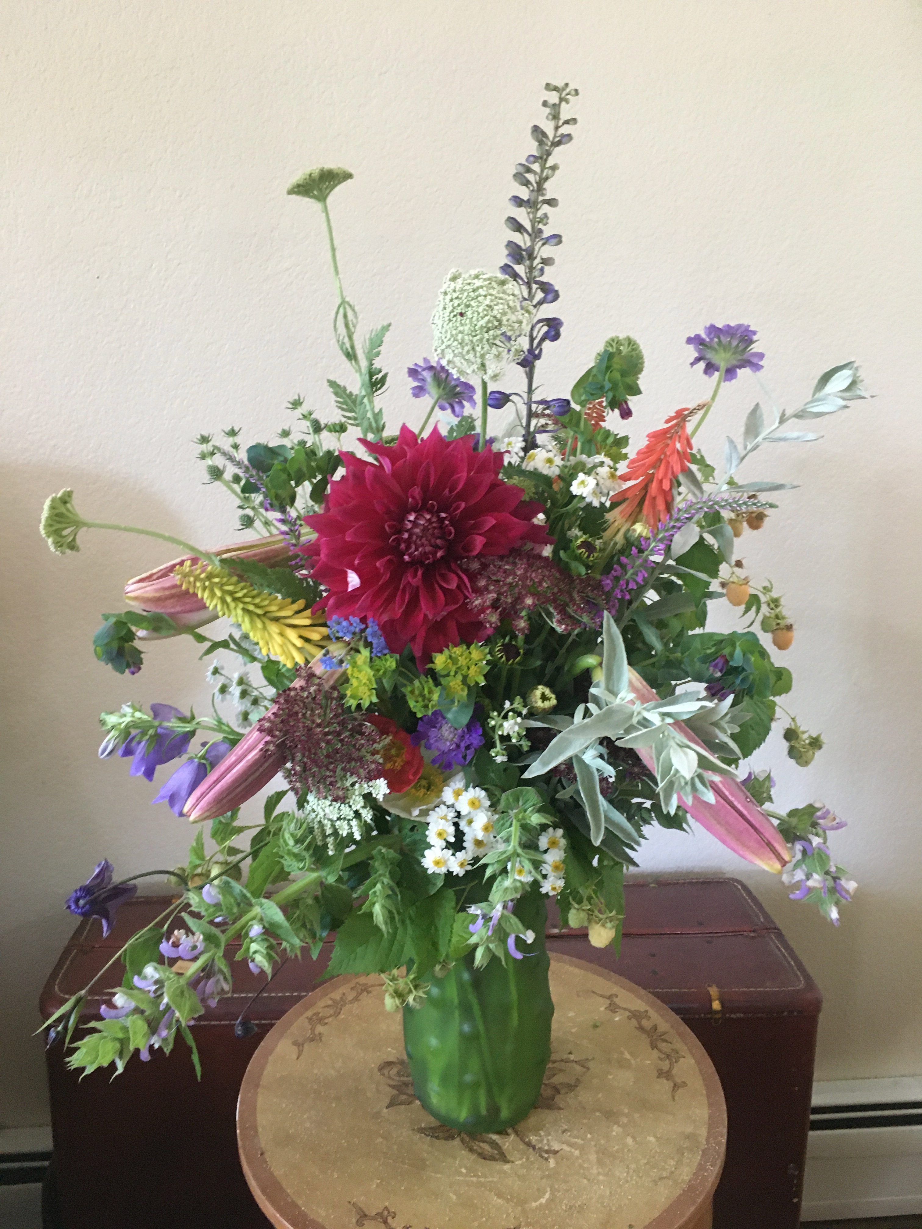 Farm Bouquets and Bundles consist of a fresh assortment of seasonal blooms, all LOCALLY GROWN. Hand selected, long lasting, colorful flowers and greens assembled in a stylistic vase for your home or business. If you want a particular color or flower, contact me and we can talk more specifically about what is in season. Seasonal Farm Flowers available May-Sept, depending on weather. All Flower requests must be made at least 24 hours in advance.
